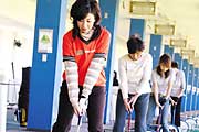 大樹のゴルフスクールは、テキストやレーザーディスクを使った教室での講義と、一人ひとりのレベルに合わせて指導する打席練習の2本立て。グリップの握り方から順に、毎回一つずつポイントをマスターしてゆく方式ですので、誰でも安心して受講できます。
